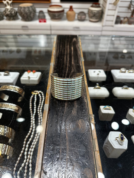 Handcrafted out of Sterling Silver and White Opal, this is an Opal 10-Row Cuff Bracelet by Anselm Wallace of Zuni.