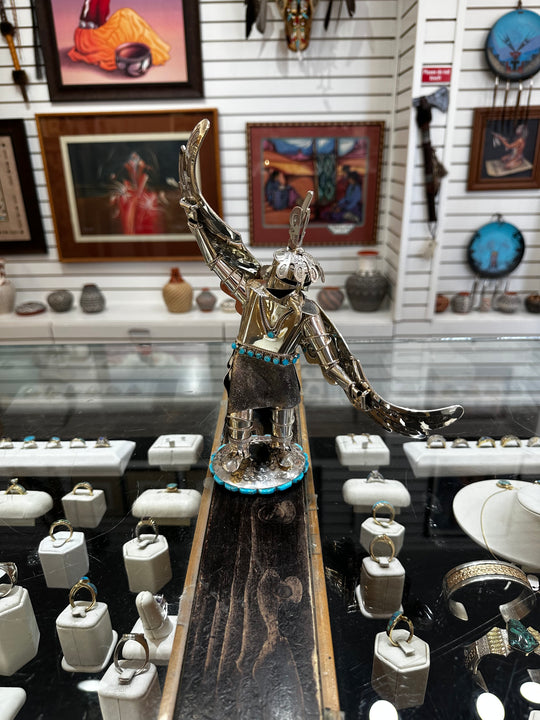 Handcrafted out of Sterling Silver and Kingman Turquoise, this is a Silver "Eagle" Kachina By Wilford Begay of the Navajo Nation. Dimensions 11"...