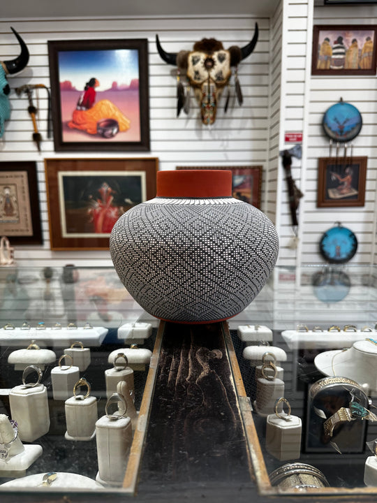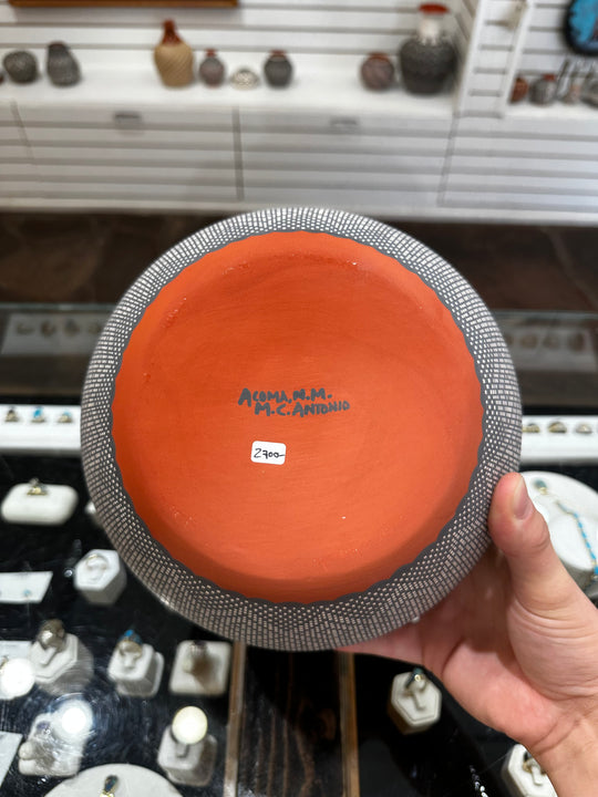 Handmade from natural clay and hand-painted with natural pigments, this is Eye-Dazzler Pottery by Melissa Antonio of Acoma. Dimensions 8" x 8"