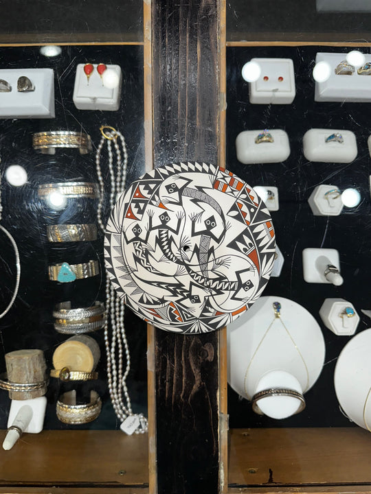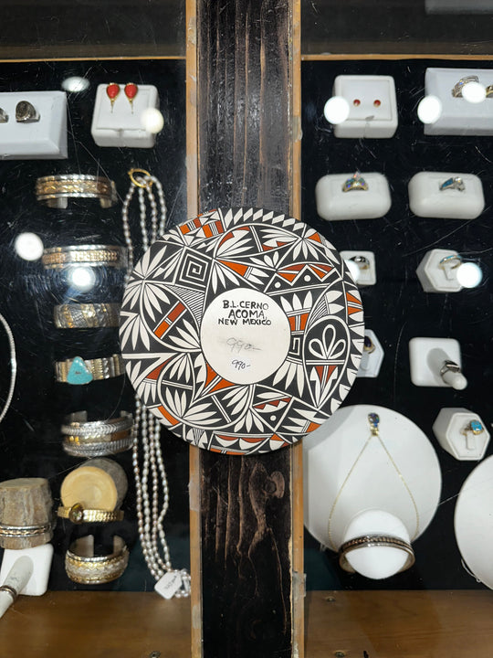 Handcrafted out of natural earth clay and hand-painted with natural dyes, this is Handcrafted Pottery B.L. Cerno of Acoma. Dimensions 6" x 3"