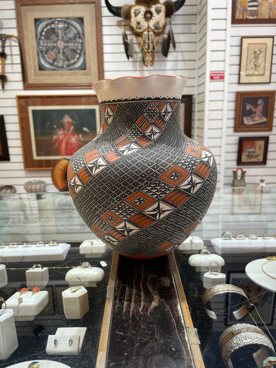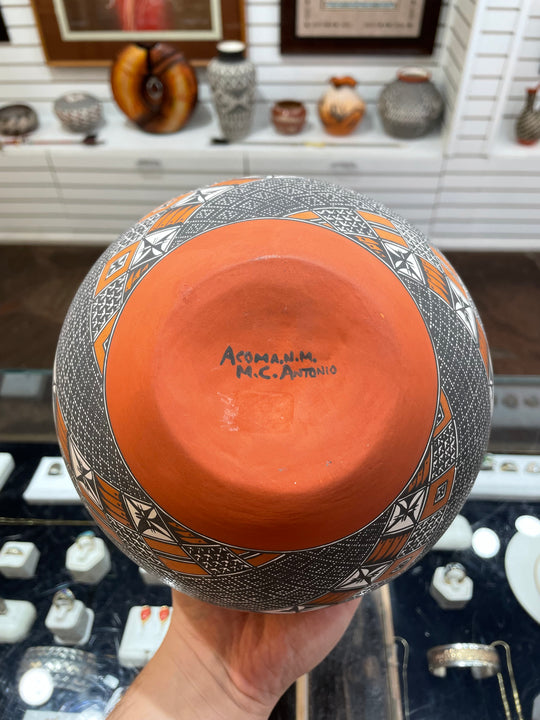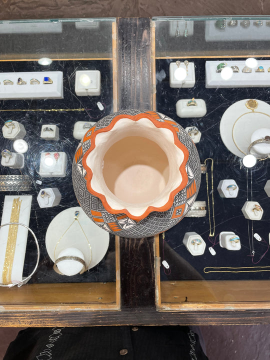 Hand-coiled, hand-fired, and hand-painted with natural earth clay and natural dyes, this is Handcrafted Pottery by Melissa Antonio of Acoma. Dimensions 9"x8"