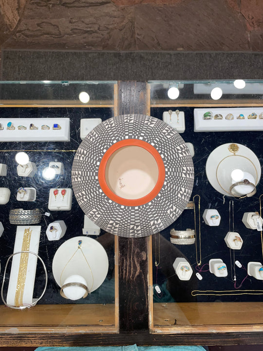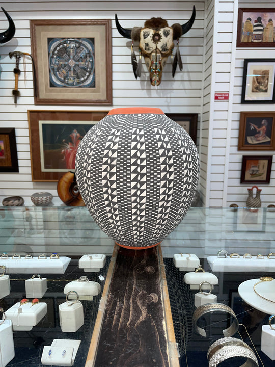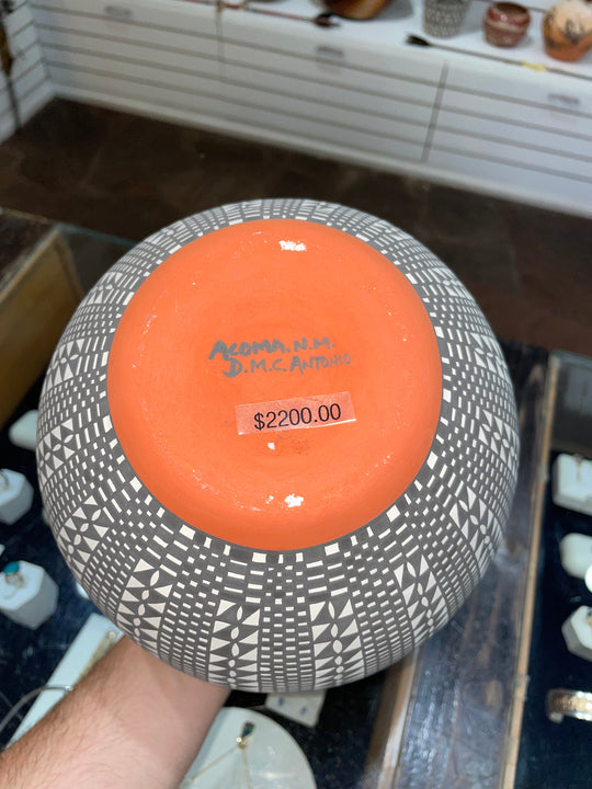 Hand-coiled, hand-fired, and hand-painted with natural earth clay and natural dyes, this is Handcrafted Pottery by Melissa Antonio of Acoma. Dimensions 9"x8"