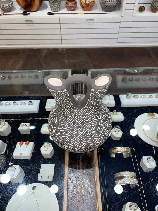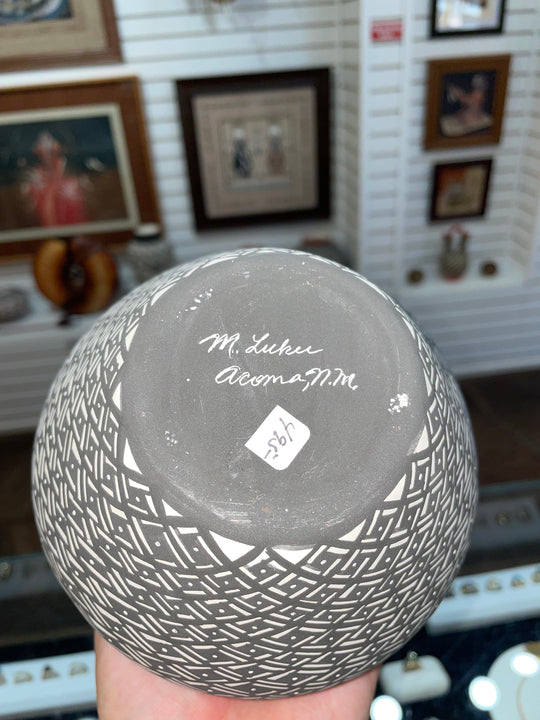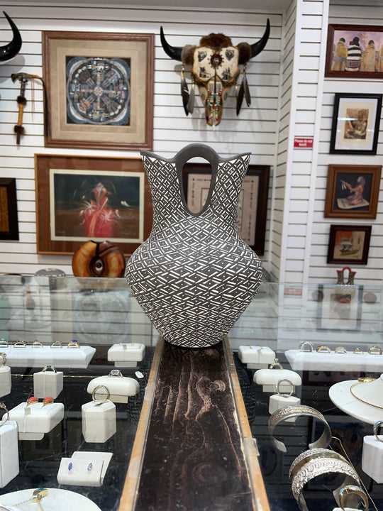 Hand-coiled, hand-fired, and hand-painted with natural earth clays and natural dyes, this is Handcrafted Pottery by Myra Lukee. Dimensions 10"x11"