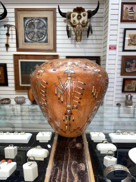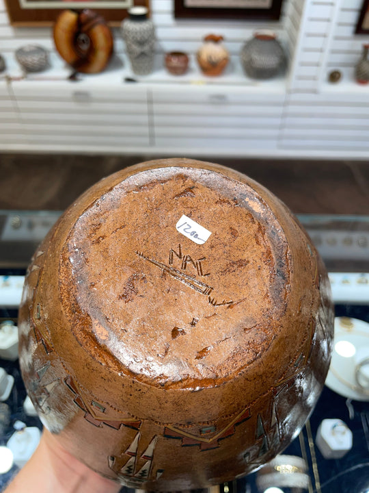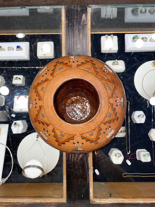 Hand-coiled, hand-fired, and hand-painted with natural earth clays and natural dyes, this is Handcrafted Pottery by Nancy Chile. Dimensions 8"x8"
