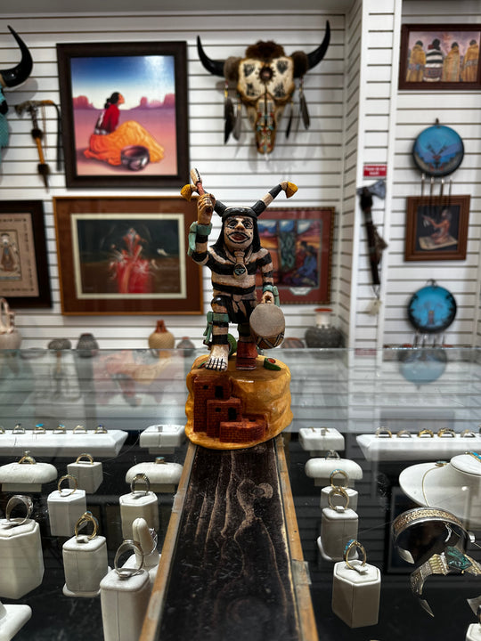 Hand-carved out of cottonwood and hand-dyed with natural pigments, this is a "Koshare" Kachina Doll by Milton Howard of Hopi. Dimensions 9"...