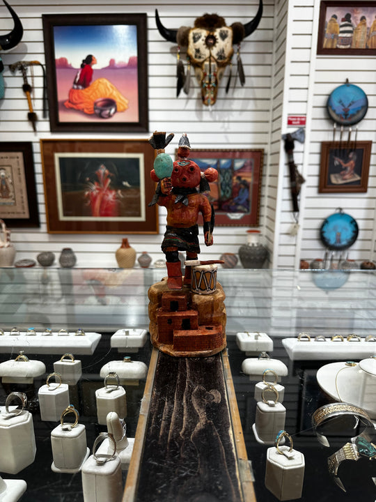 Hand-carved out of cottonwood and hand-dyed with natural pigments, this is a "Mudhead" Kachina Doll by Milton Howard of Hopi. Dimensions 10"...