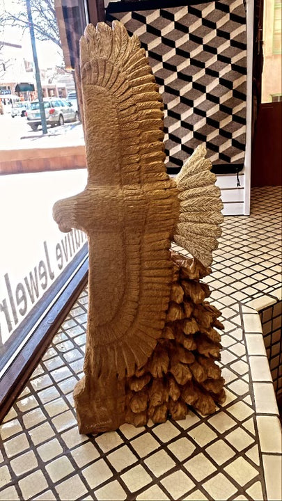 Hand-sculpted out of Texas Limestone, this an Eagle Sculpture by Tim Washburn. Dimensions 33" x 10"