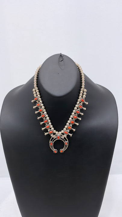 Made with .925 Sterling silver and natural Red Corral, this is a Woman’s Squash Blossom Necklace & Earring Set.